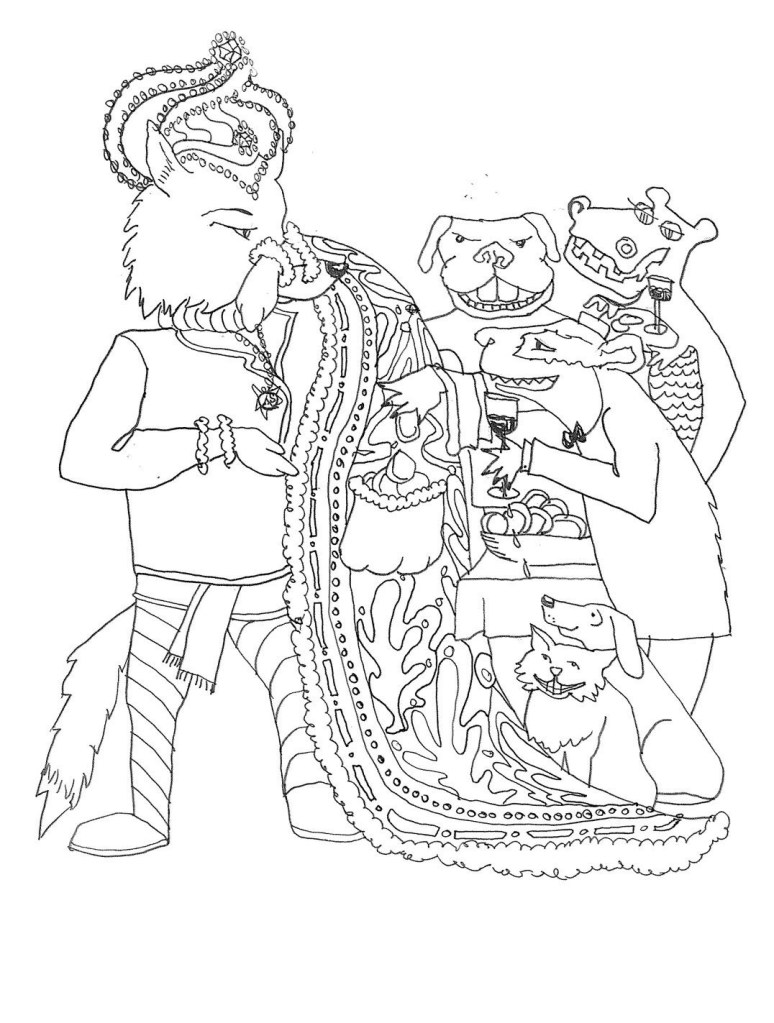 Once upon a time I was a graphic designer. Occasionally that called for an illustration and recently I had the opportunity to try my hand at it again. The drawing below illustrates a story. This is the story of a rich man working in his garden who was invited by a neighbor to come to a party. As the hour was late he simply went dressed as he was. Unrecognized in his worn clothes, he was insulted by guests who thought he was a beggar. Then he was thrown out by the bouncer. He went home, showered and decided to teach them all a lesson. He dressed in his finest, including a rare and beautiful coat, and returned to the party. All who saw him tried to curry his favor, offering food and drink. “Feed my coat” he said, “because clearly that is what you value, not the person inside.” And he left.
